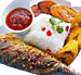A flavorful fish and rice dish cooked with vegetables like carrots, eggplant, and cassava.